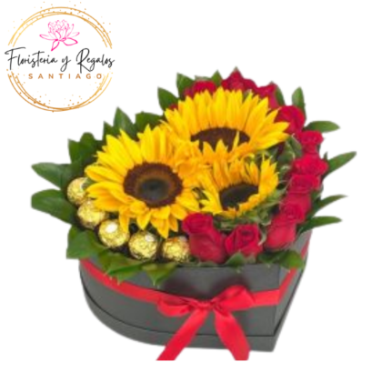 CAJA RECTANGULAR DE 10 ROSAS, 1 GIRASOL, 10 TULIPANES Y GLOBO