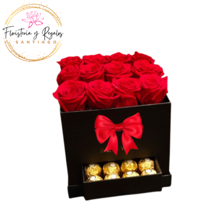 CAJA BOX CUADRADA DE 12 ROSAS ECUATORIANAS Y 8 BOMBONES