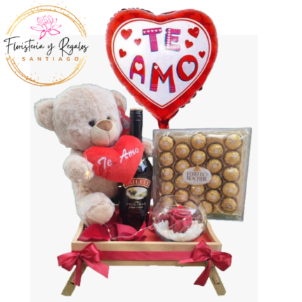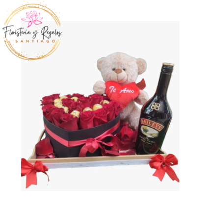 BANDEJA CAJA CORAZON DE ROSAS Y BOMBONES +PELUCHE DE 25CM Y BAILEYS
