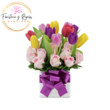 CAJA BOX DE 10 TULIPANES Y 10 ROSAS ECUATORIANAS