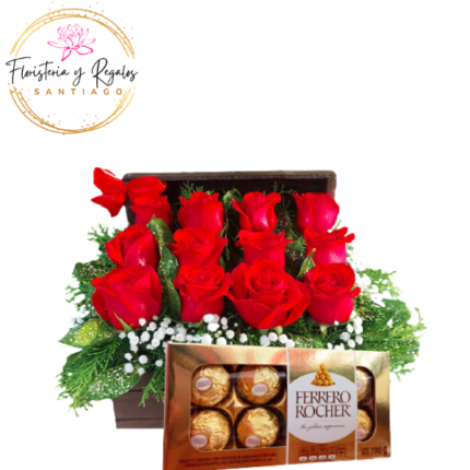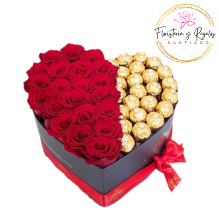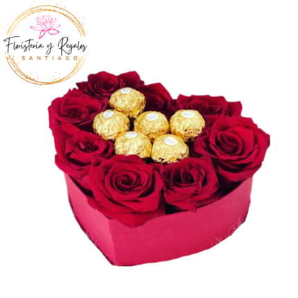 CAJA CORAZON DE 12 ROSAS Y 20 BOMBONES FERREROS ROCHER