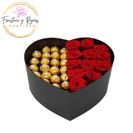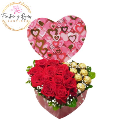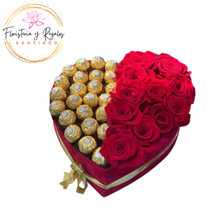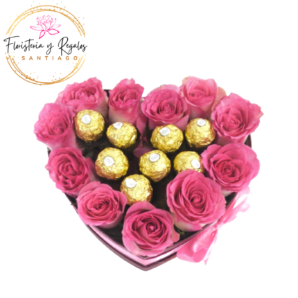 CAJA CORAZON DE 15 ROSAS Y 16 BOMBONES FERREROS ROCHER