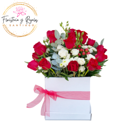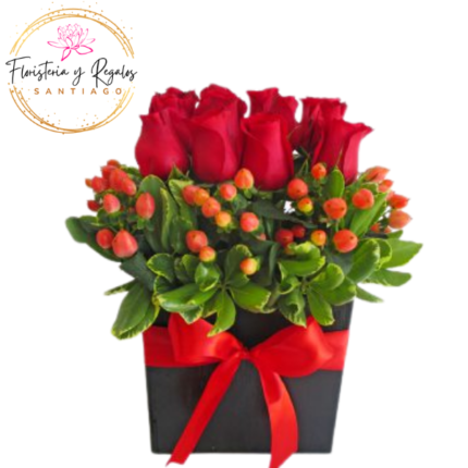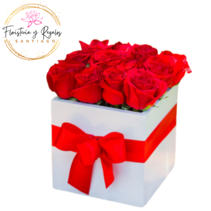 CAJA BOX CUADRADO DE 12 ROSAS IMPORTADAS Y FOLLAJE