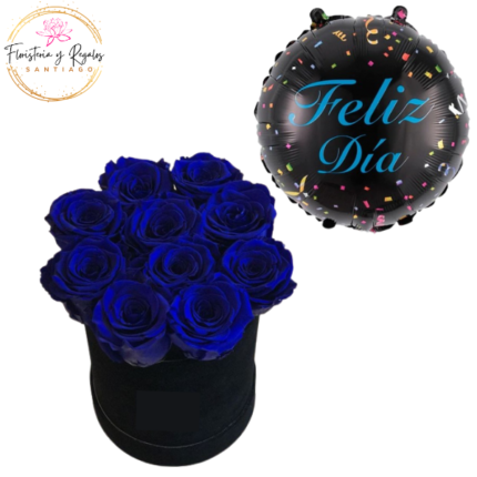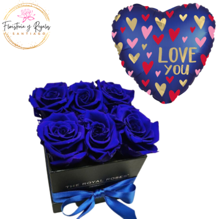 CAJA BOX DE 12 ROSAS ECUATORIANAS, BOMBONES Y GLOBO