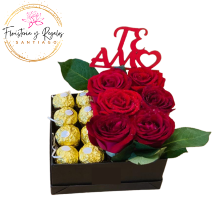 CAJA CUADRADA DE 6 ROSAS ECUATORIANAS, 8 BOMBONES Y TOPPER