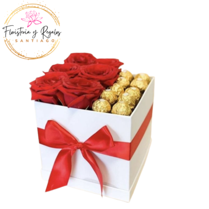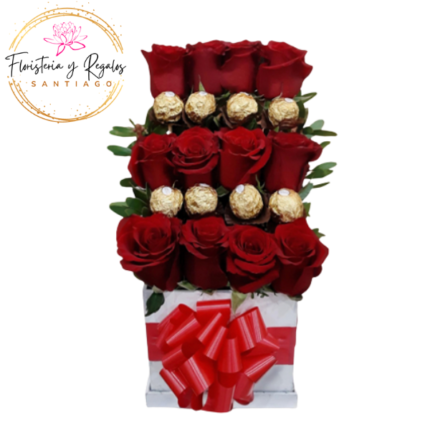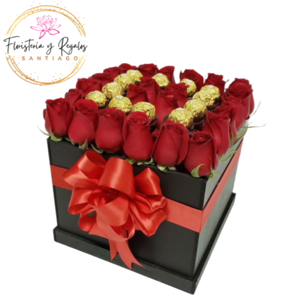 CAJA CUADRADA DE 24 ROSAS IMPORTADAS Y 12 BOMBONES FERREROS ROCHER