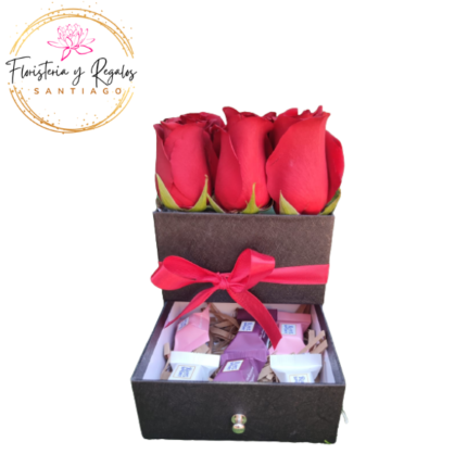 CAJA BOX DE 22 ROSAS ECUATORIANAS Y 3 BOMBONES FERREROS