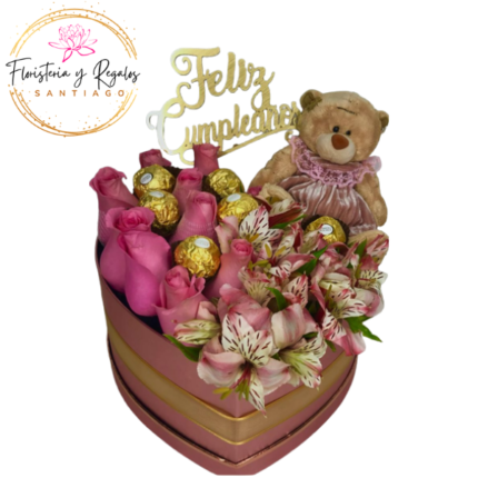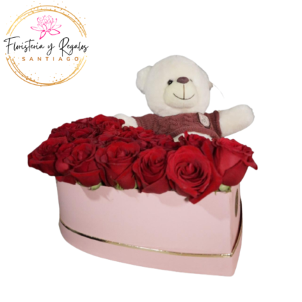 CAJA CORAZON DE 12 ROSAS Y PELUCHE DE 25CM
