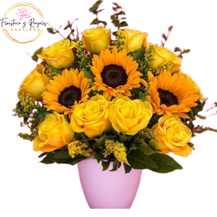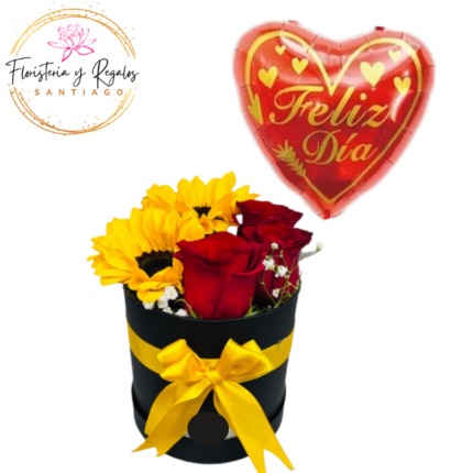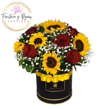 CAJA BOX DE 8 ROSAS, 8 GIRASOLES Y FOLLAJE