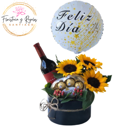 BOX 3 GIRASOLES, BOMBONES FERREROS ROCHER 100GRS, VINO 750ML Y GLOBO