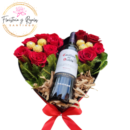 CAJA CORAZON DE 10 ROSAS, 6 BOMBONES Y VINO 750ML