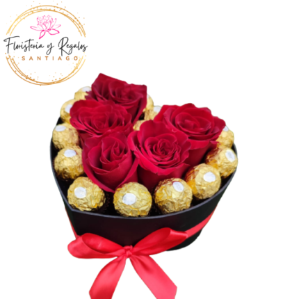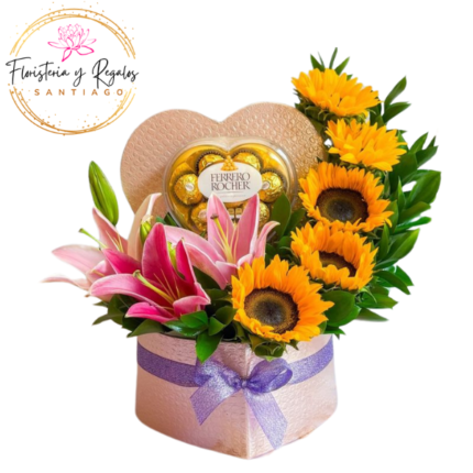 CAJA CORAZON DE 10 ROSAS, 3 GIRASOLES Y 5 BOMBONES FERREROS ROCHER