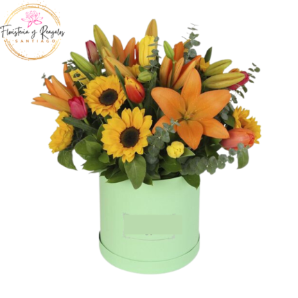 CAJA BOX DE 6 ROSAS, GIRASOL, 5 TULIPANES Y FOLLAJE