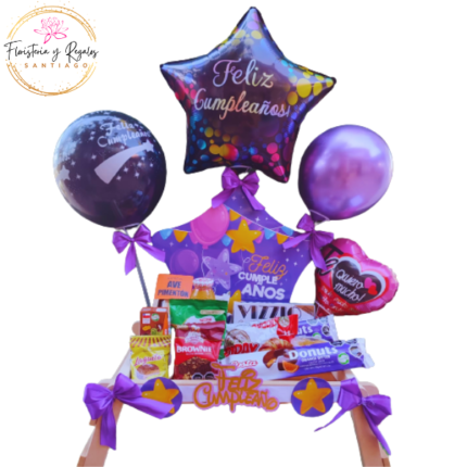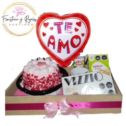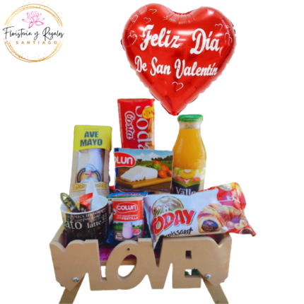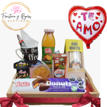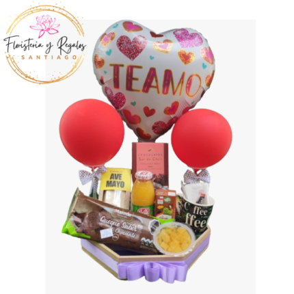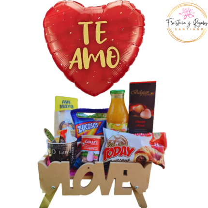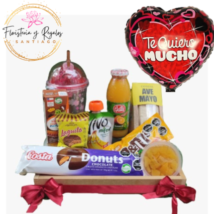 DESAYUNO EN CAJA, PELUCHE, PAN SANDWICH, JUGO, MIX CHOCOLATES, CHOCOLATICOS, BARRA DE CHOCOLATE, LECHE SABORIZADA, ENVASE TOMATODO, GLOBOS