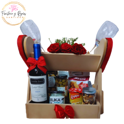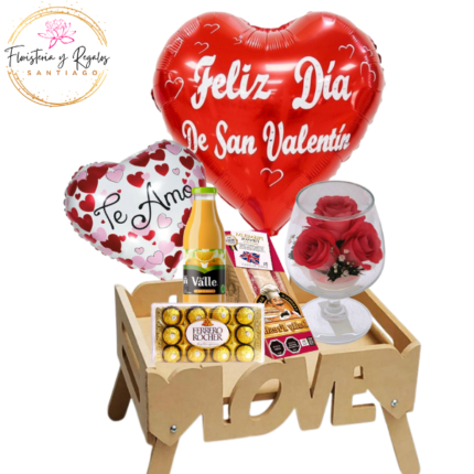 BANDEJA DOS ROSAS VINO 750ML COPAS Y FERREROS DE 300G