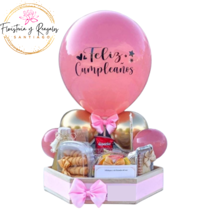 DESAYUNO HEXAGONAL PAN SANDWICH, TEQUEÑOS, JUGO, FRUTAS, GALLETA Y GLOBOS