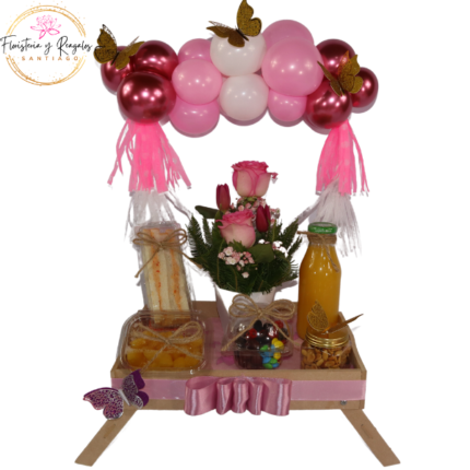 DESAYUNO EN BANDEJA ACRILICA CON PAN SANDWICH, BEBIDA, JUGO, GALLETAS, FRUTOS SECOS, TOQUE FLORAL, GLOBO BURBURJA Y DECORACION