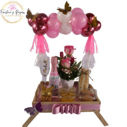 DESAYUNO ARCO DE GLOBOS + BOX FLORAL CHAMPAGNE DE 375ML JUGO Y PAN