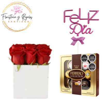 CAJA 9 ROSAS + BOMBONES FERREROS + TOPPER