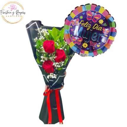 RAMO DE 3 ROSAS FOLLAJE Y GLOBO