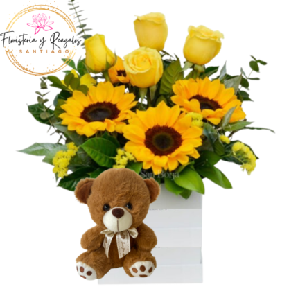 BOX 4 GIRASOLES 4 ROSAS + PELUCHE 20 CM