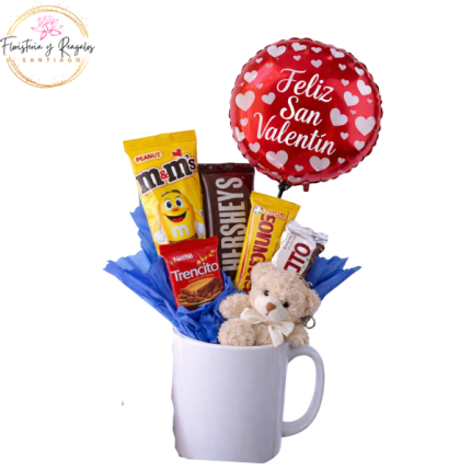 TAZA LOVE CON 5 BARRAS DE CHOCOLATES, PELUCHITO LLAVERO Y GLOBITO