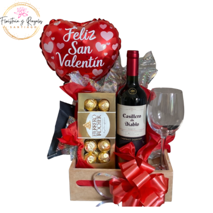 ARREGLO ENAMORADOS DE 1 VINO 750ML, COPA, FERRERO ROCHER 100 GRS Y GLOBITO