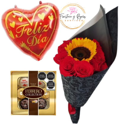 RAMO 10 ROSAS, GIRASOL, FERRERO ROCHER COLECCION Y GLOBO