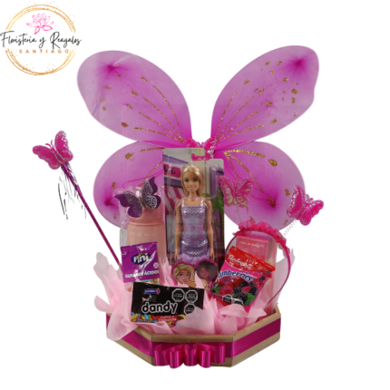 ARREGLO HEXAGONAL CON BARBIE, SPLAH, COOLER, BARBIE, 3 GOLOSINAS Y DECORACION