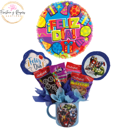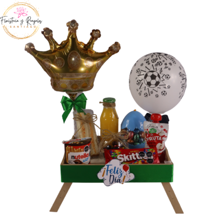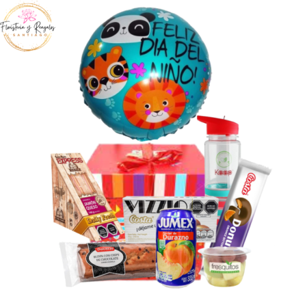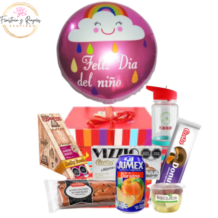 DESAYUNO EN CAJA, PELUCHE, PAN SANDWICH, JUGO, MIX CHOCOLATES, CHOCOLATICOS, BARRA DE CHOCOLATE, LECHE SABORIZADA, ENVASE TOMATODO, GLOBOS