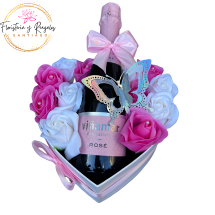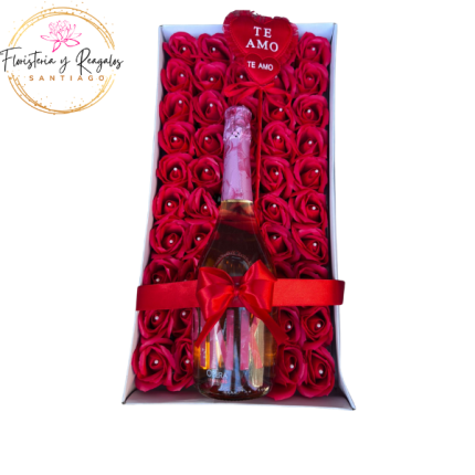 CAJA CORAZON DE 12 ROSAS ETERNAS CON CHAMPAGNE DE 375ML