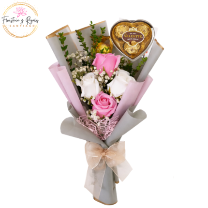 RAMO DE 4 ROSAS JABON, FOLLAJE Y GYPSOPHILA Y BOMBONES CORAZON VALENTTE 3UNID