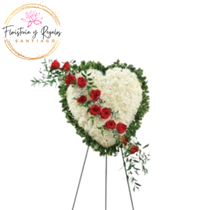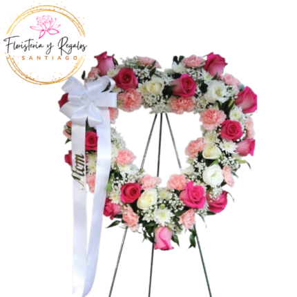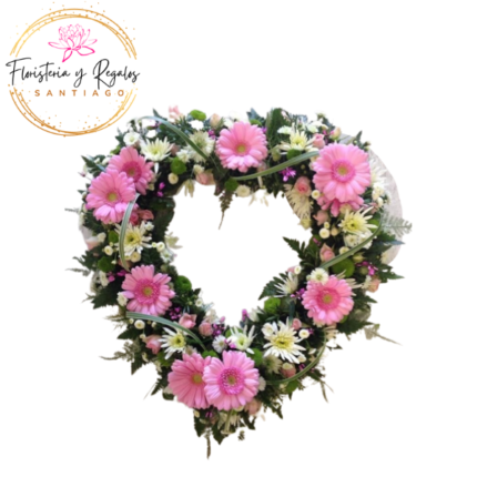 CORONA CORAZON DE 3 GERBERAS, 6 ROSAS, 6 LILIUM, MARGARITAS, FOLLAJE Y ATRIL