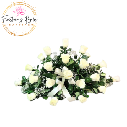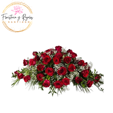 CORONA FUNEBRE CON 25 ROSAS, 20 CLAVELES, CINTA Y ATRIL