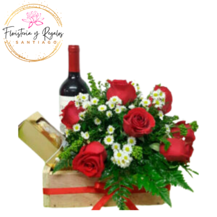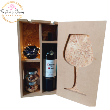 CAJA DIVISORA CON VINO 750ML, ROSA PRESERVADA, FRUTOS SECOS Y LUCES