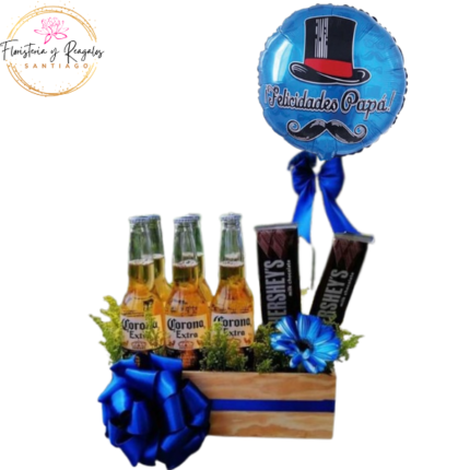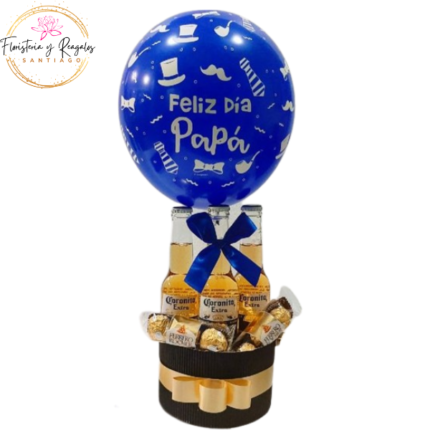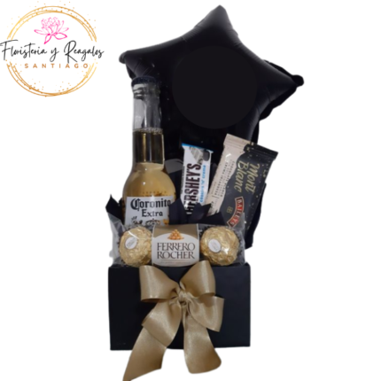 ARREGLO DE 1 CERVEZA, BOMBONES, 3 BARRAS DE CHOCOLATE Y GLOBO