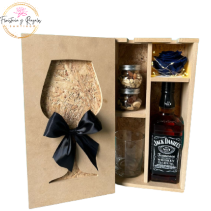 CAJA ESPECIAL DIVISORA WHISKY, VASO, FRUTOS SECOS Y ROSA PRESERVADA CON LUCES
