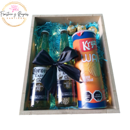 BANDEJA DE MADERA CON 2 CERVEZAS, PAPAS Y BOMBONES