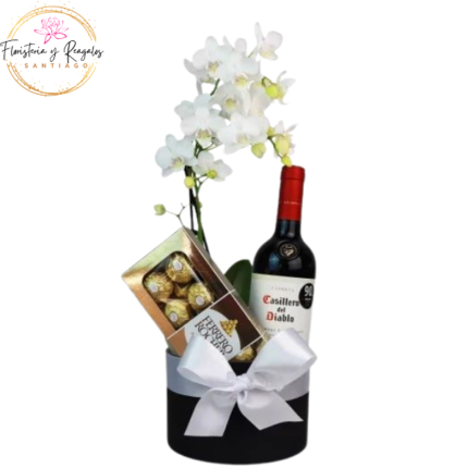 BOX CON 1 VARA DE ORQUIDEA, VINO 750ML Y BOMBONES