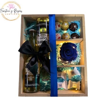 BASE RECTANGULAR DE 2 CERVEZAS, 10 BOMBONES Y ROSA PRESERVADA CON LUCES