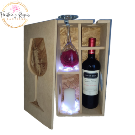 CAJA DIVISORA CON VINO DE 750ML, ROSA PRESERVADA, COPA, VELA Y LUCES
