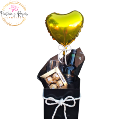 CAJA CUADRADA CON BOTELLA DE VINO + FERREROS 100G COPAS Y GLOBO
