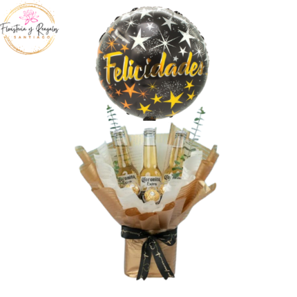 RAMO DE 3 CERVEZA, 3 BOMBONES, FOLLAJE Y GLOBO