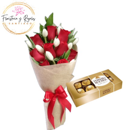 RAMO DE 10 ROSAS, 10 TULIPANES Y FERREROS ROCHER 100GRS