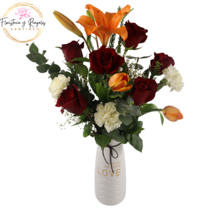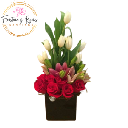 FLORERO DE ROSAS, TULIPANES, LILIUM Y FOLLAJE DE TEMPORADA