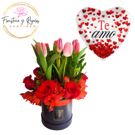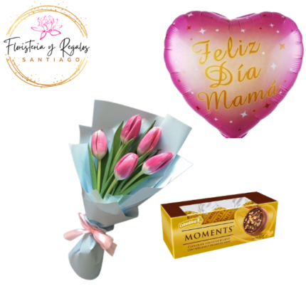 RAMO DE 5 TULIPANES + CAJA DE BOMBONES + GLOBO