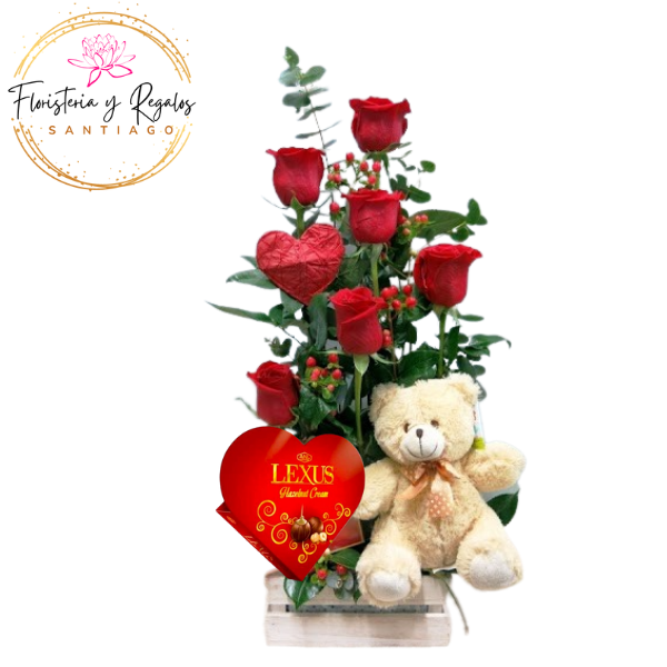 ARREGLO DE 6 ROSAS + PELUCHE DE 20 CM Y BOMBONES