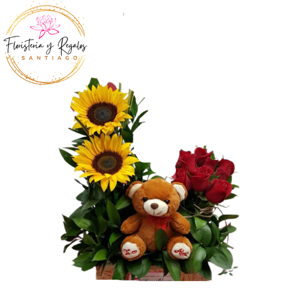 ARREGLO EN BASE DE 6 ROSAS 2 GIRASOLES+ PELUCHE 20 CM