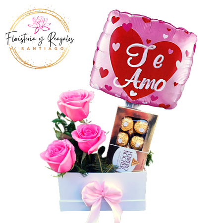 CAJA RECTANGULAR 3 ROSAS + FERREROS ROCHER 100G + GLOBO