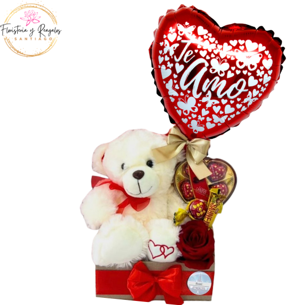 BASE DE MADERA CON 1 ROSA, PELUCHE DE 25CM, BOMBONES 5 CORAZON, 2 CHOCOLATITOS Y GLOBO